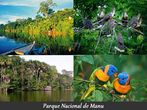 El Parque Nacional del Manu es el área natural protegida más diversa delPeru y el Mundo con habitas que van desde 200 msnm en los bosques amazónicos en la confluencia del rio Manu hasta los 3800 msnm en la zona de puna en los Andes peruanos que abarca una superficie de 17.163 km2, declarado patrimonio de humanidad por la UNESCO y zona núcleo de la Reserva de Biosfera en 1987. El Parque Nacional del Manu es la morada de varios grupos étnicos como Matshiguenka, Jarambut, Yines y poblaciones en aislamiento voluntario como los Mashcopiros. En el Manu sea reportado la existencia 10.000 especies de plantas. 250 variedades de árboles en una hectárea, 221 especies de mamíferos, 1200 especies de mariposas, más de 300 especies de hormigas, 210 especies de peces, 155 espicies de anfibios, 132 especies reptiles y 1025 especies de aves (10% de la poblacion mundial). ElParque Nacional del Manu al ser conciderado como uno de los pocos bosques pristinos en el planeta, es un paraíso en evolución natural.